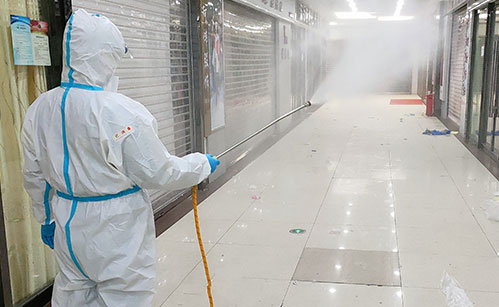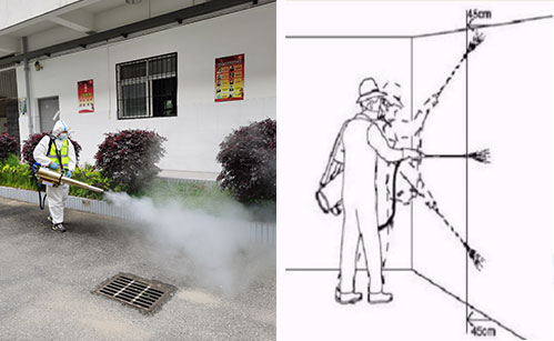 噴霧技術:掛流狀態(tài); 1、橫向噴灑幅度為75 cm; 2、左右幅度間應有5 cm的重疊; 3、自上向下噴灑; 4、首先自上向下噴灑,結束一個噴灌噴 灑幅度 后,順時針橫移,開始下一個幅度噴灑; 5、保持噴嘴距離墻面45 cm; 6、開始噴灑時首先向前傾斜,當噴嘴向下噴灑時,身體向后傾斜; 7、自時口順時針操作,直至房間處理完畢; 8、對人體接觸較多的柜臺、桌椅、門把手、水龍頭等可用0.2%-0.5%過氧乙酸溶液或有效氯為500mg/L-1000mg/L的二氧化氯消毒劑進行噴灑或擦拭消毒,作用時間15-30分鐘。